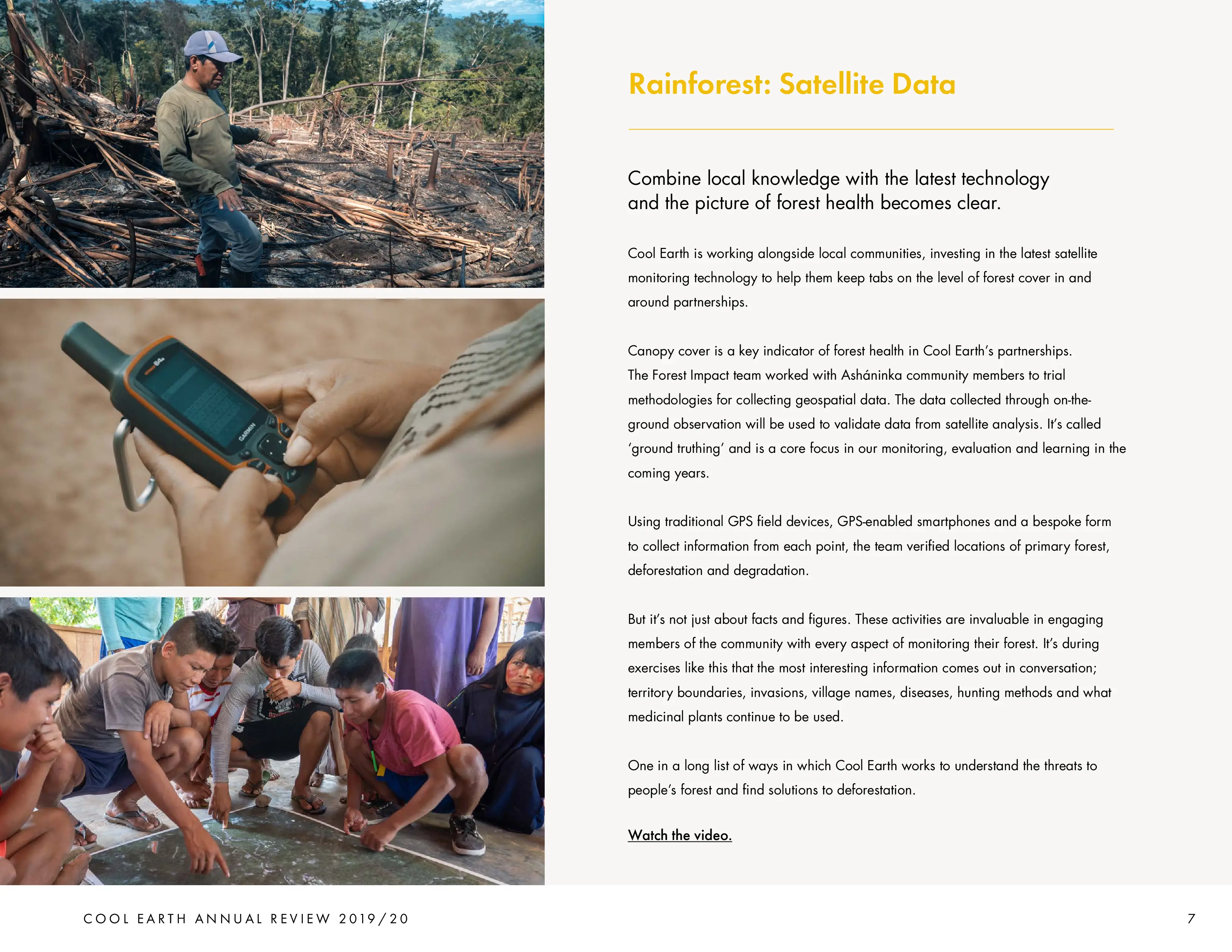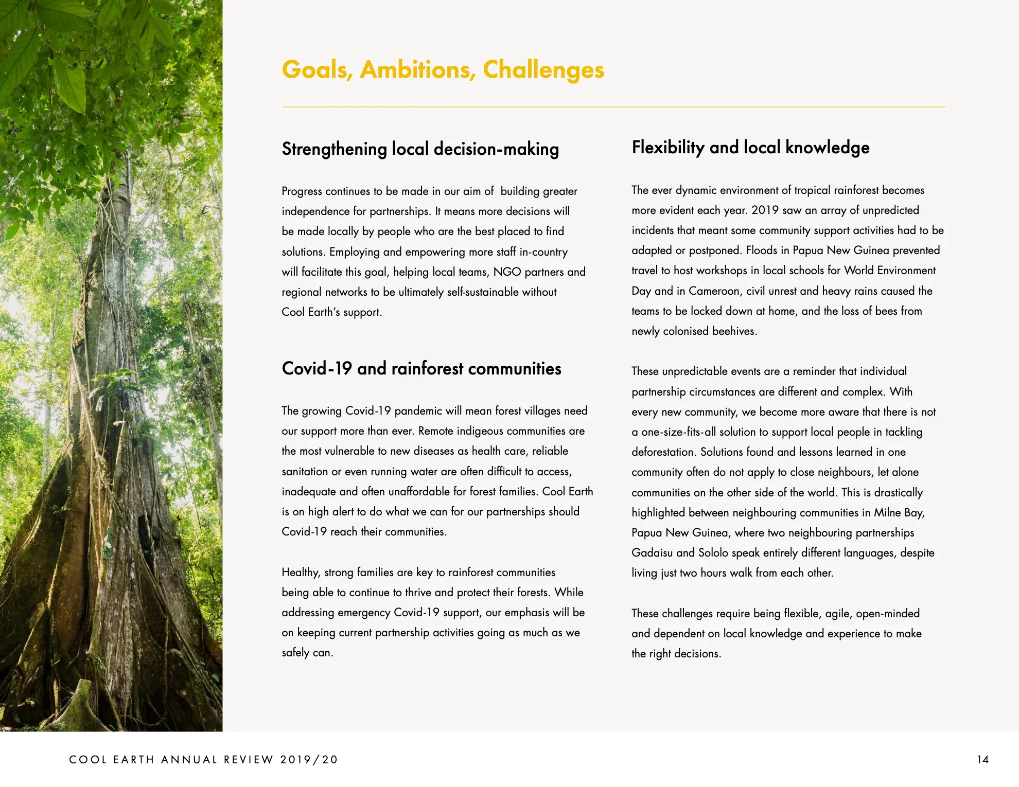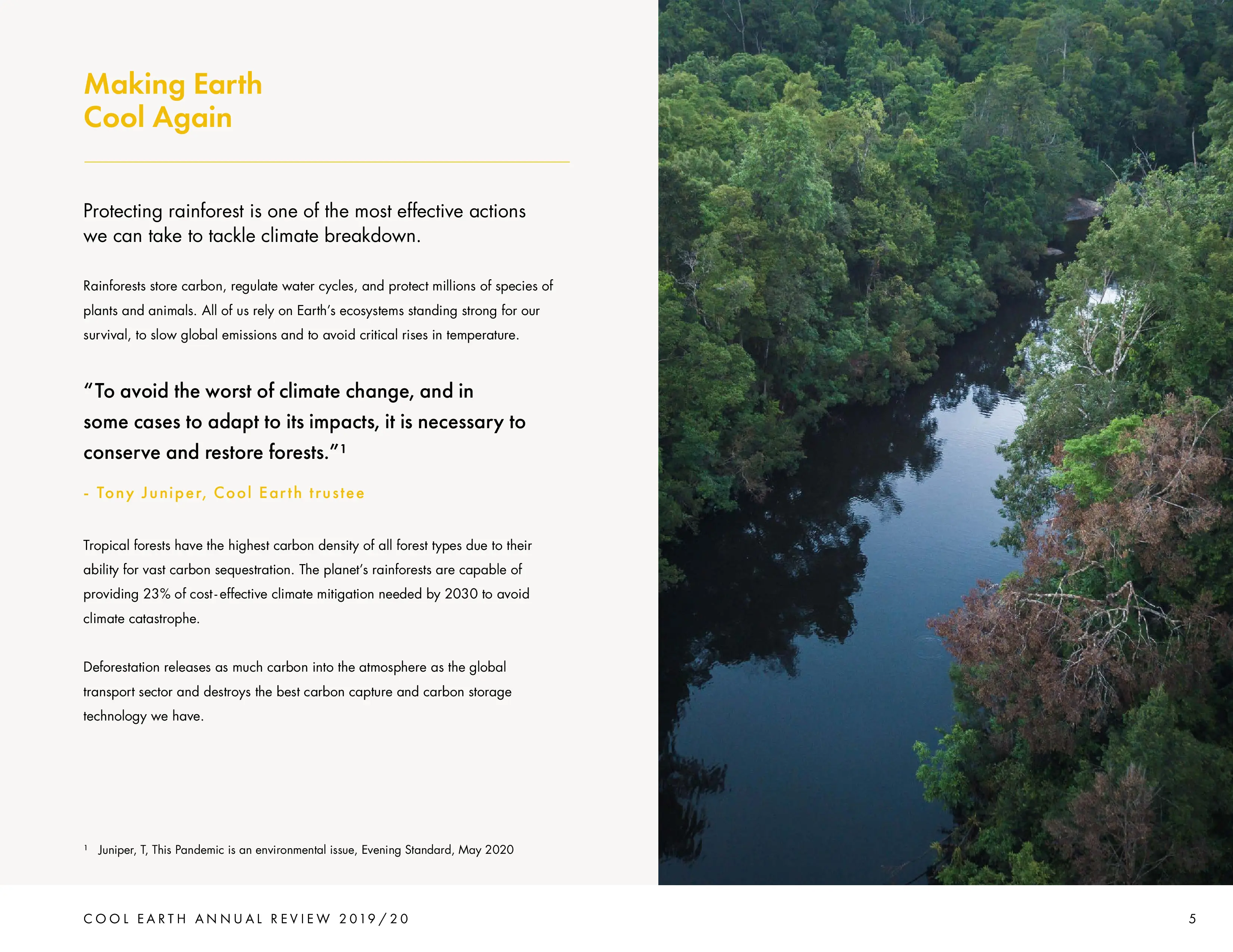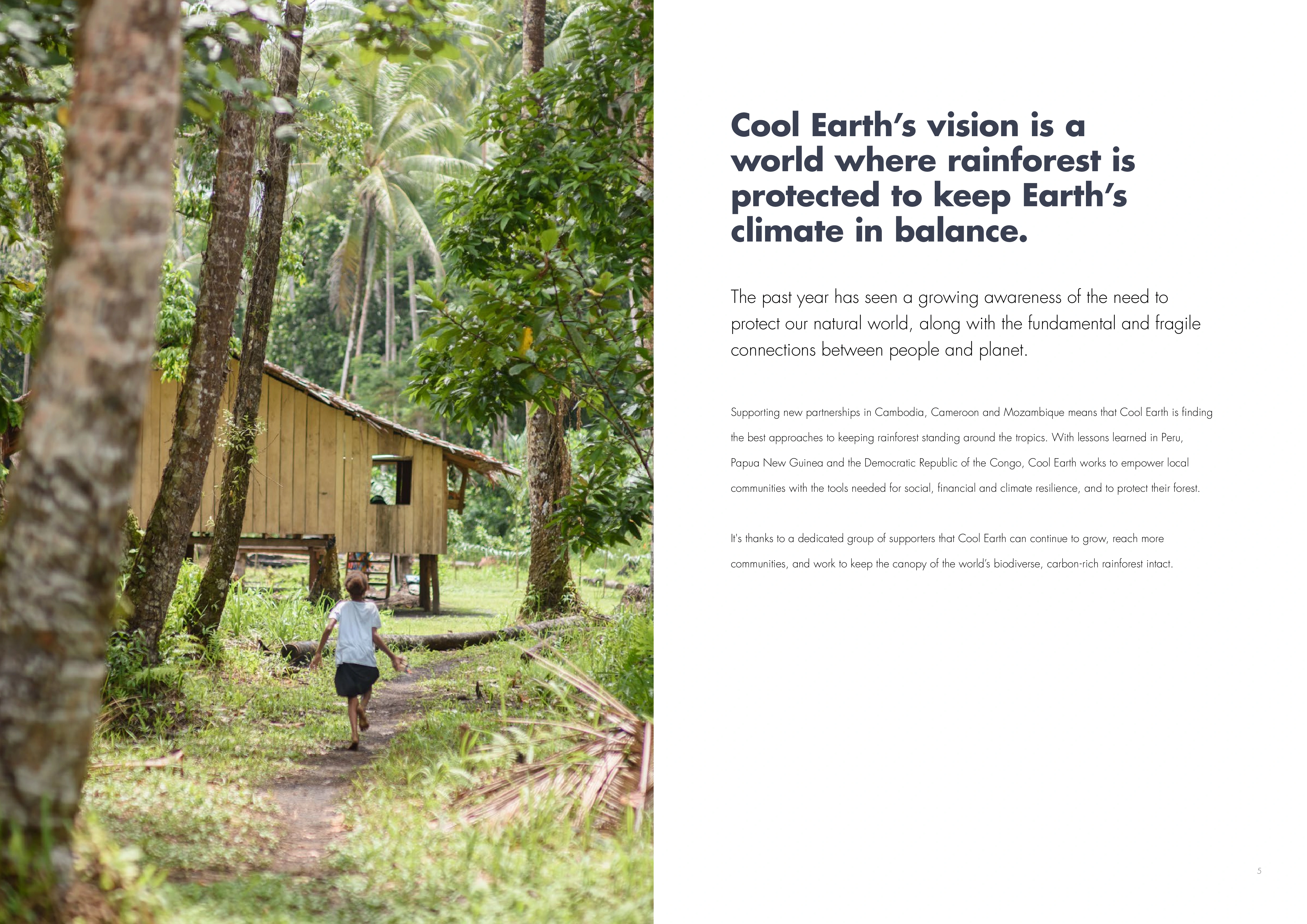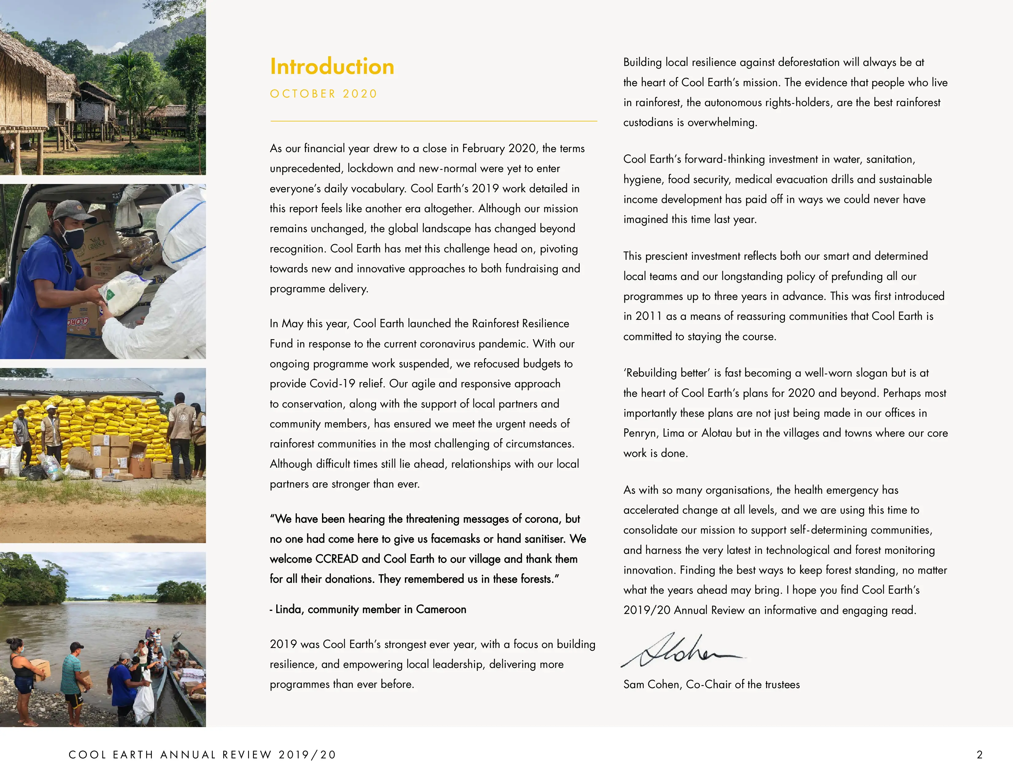 The Annual Review for 2019/2020 designed for Cool Earth to tell people what the charity is set up to do, what projects and activities happened and what it achieved each year.