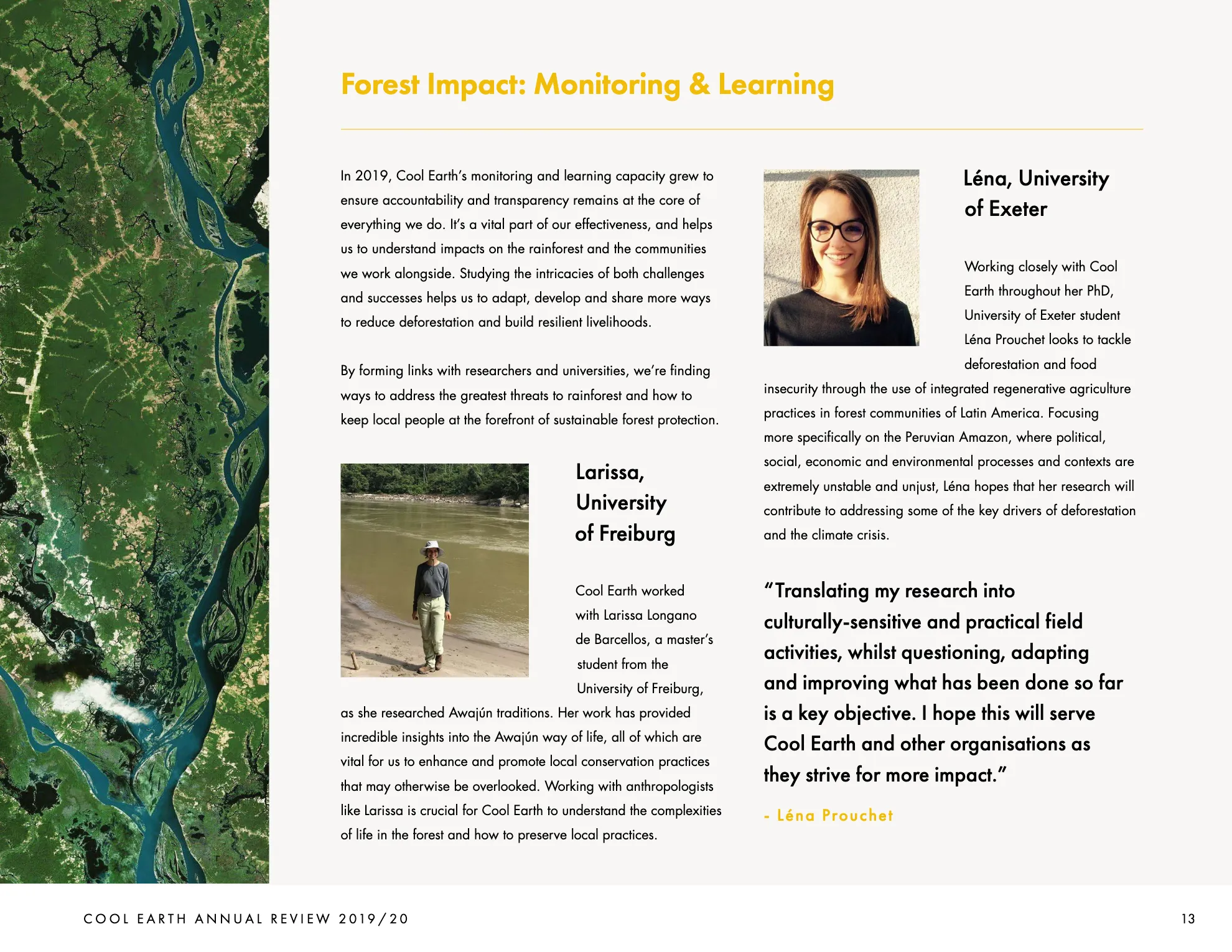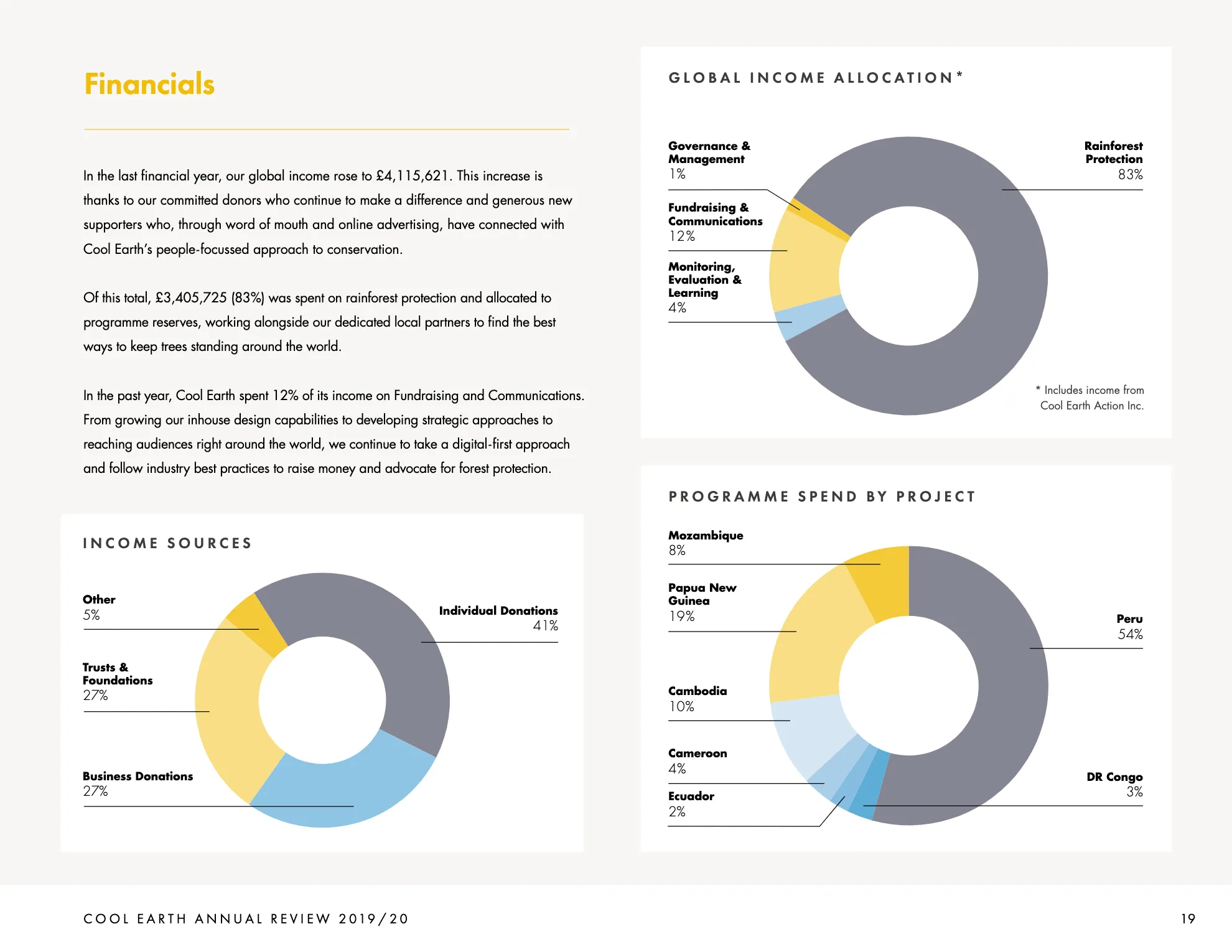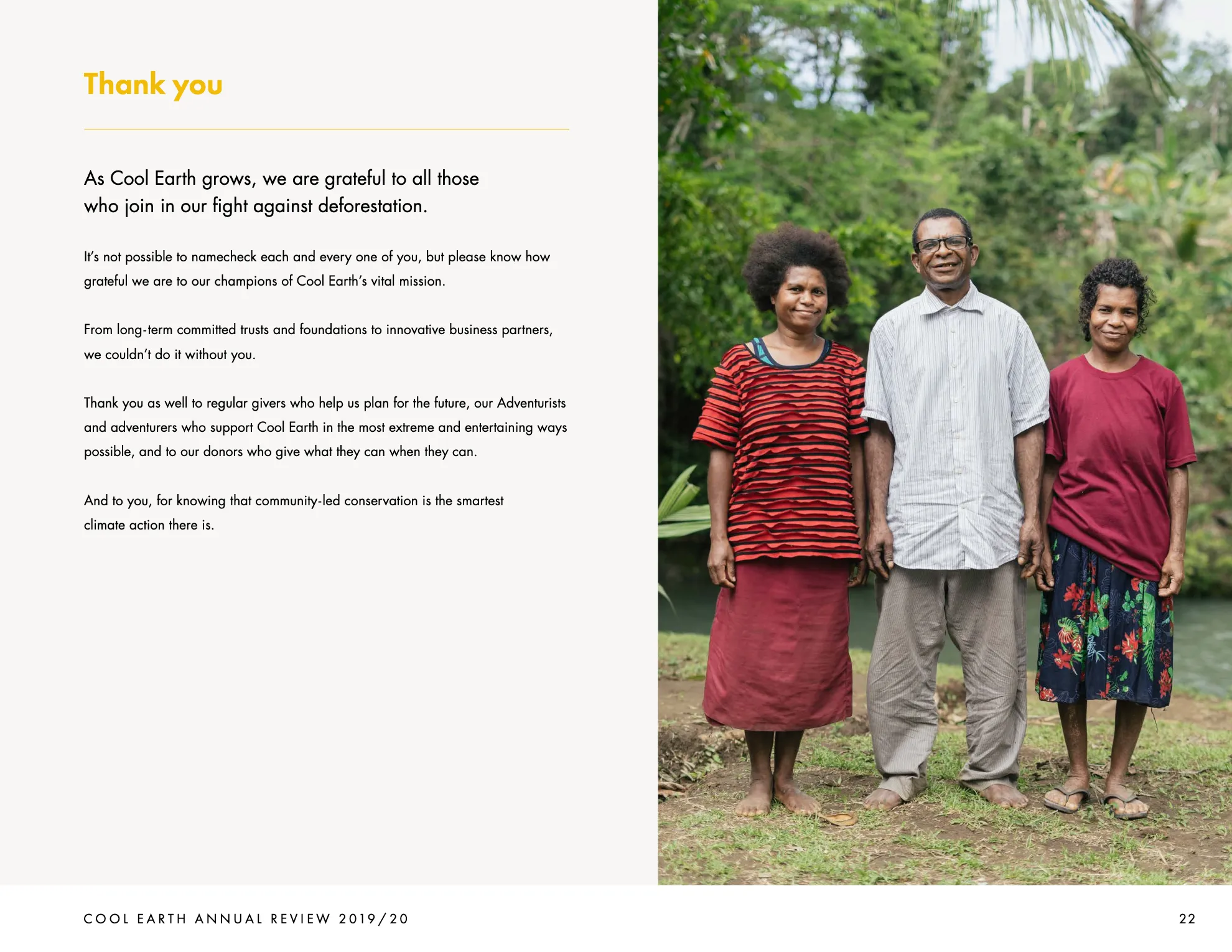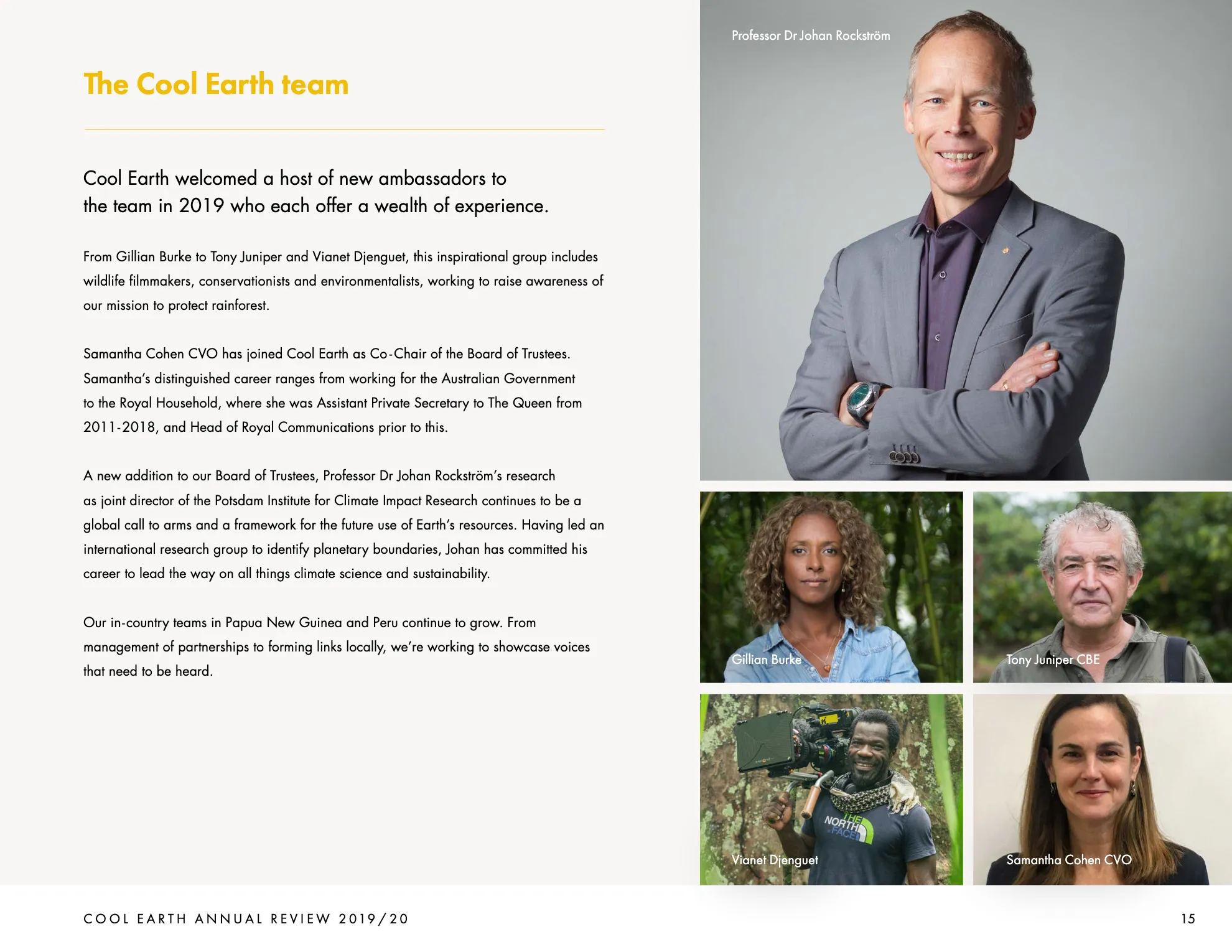 The Annual Review for 2019/2020 designed for Cool Earth to tell people what the charity is set up to do, what projects and activities happened and what it achieved each year.