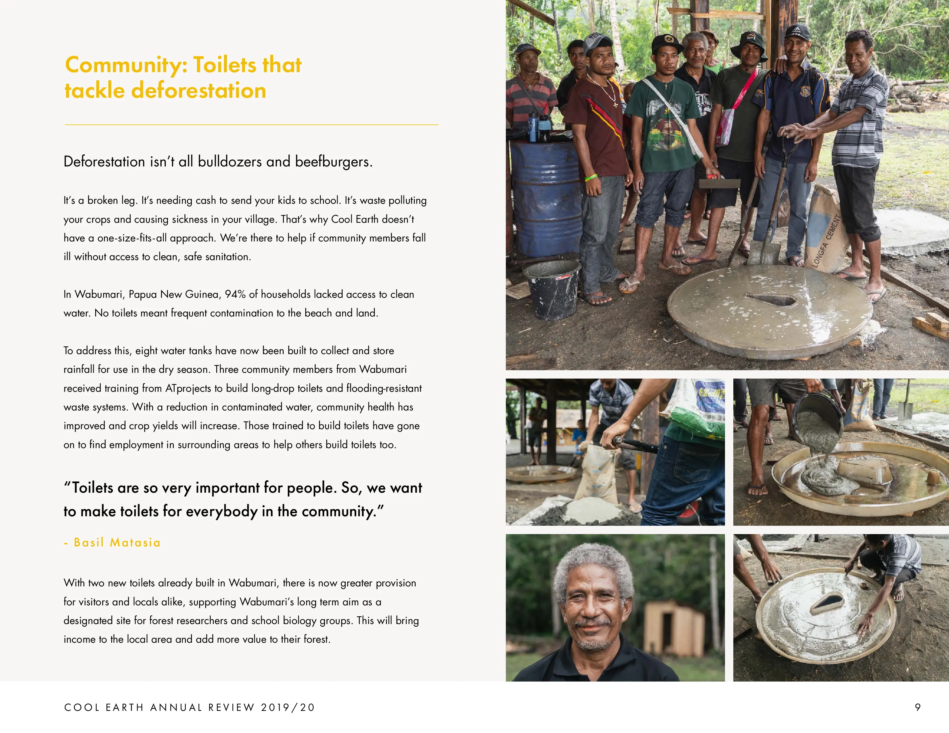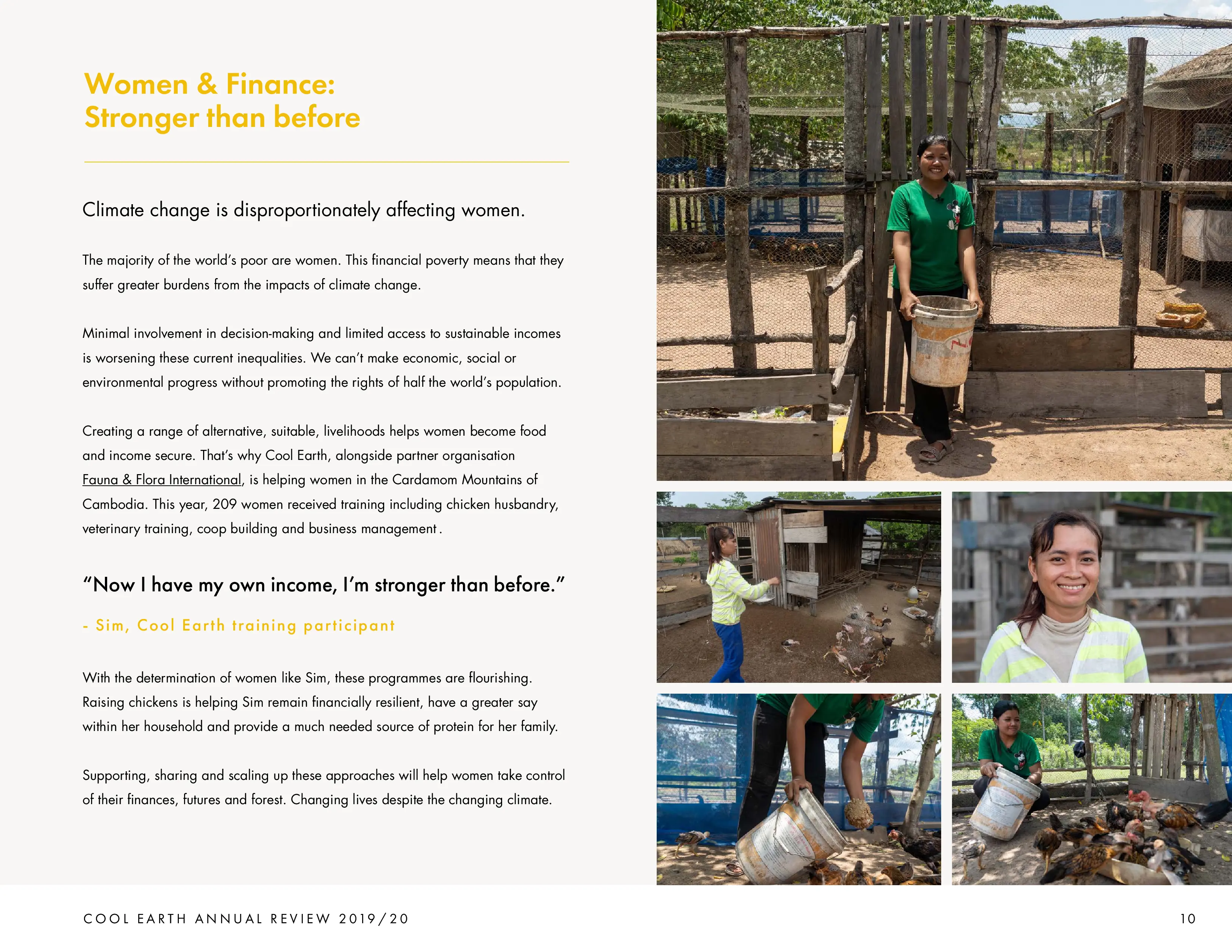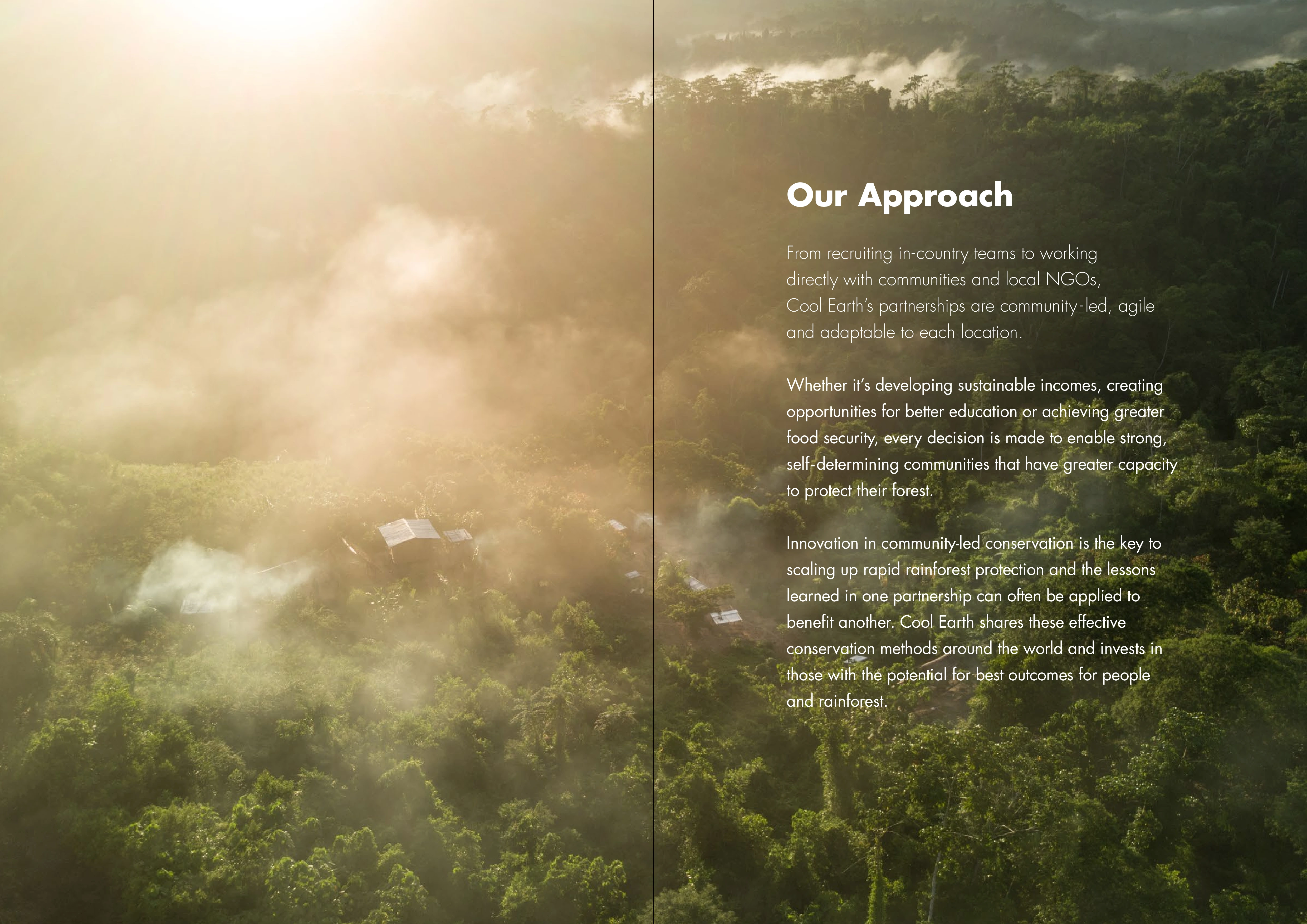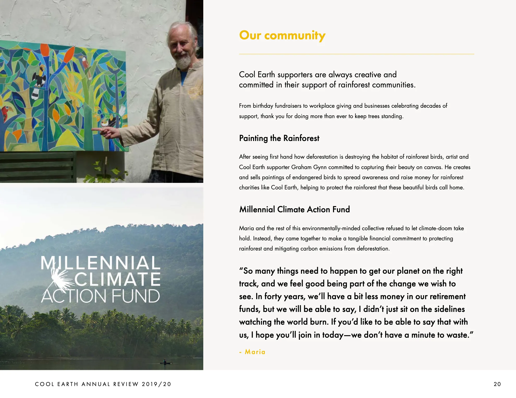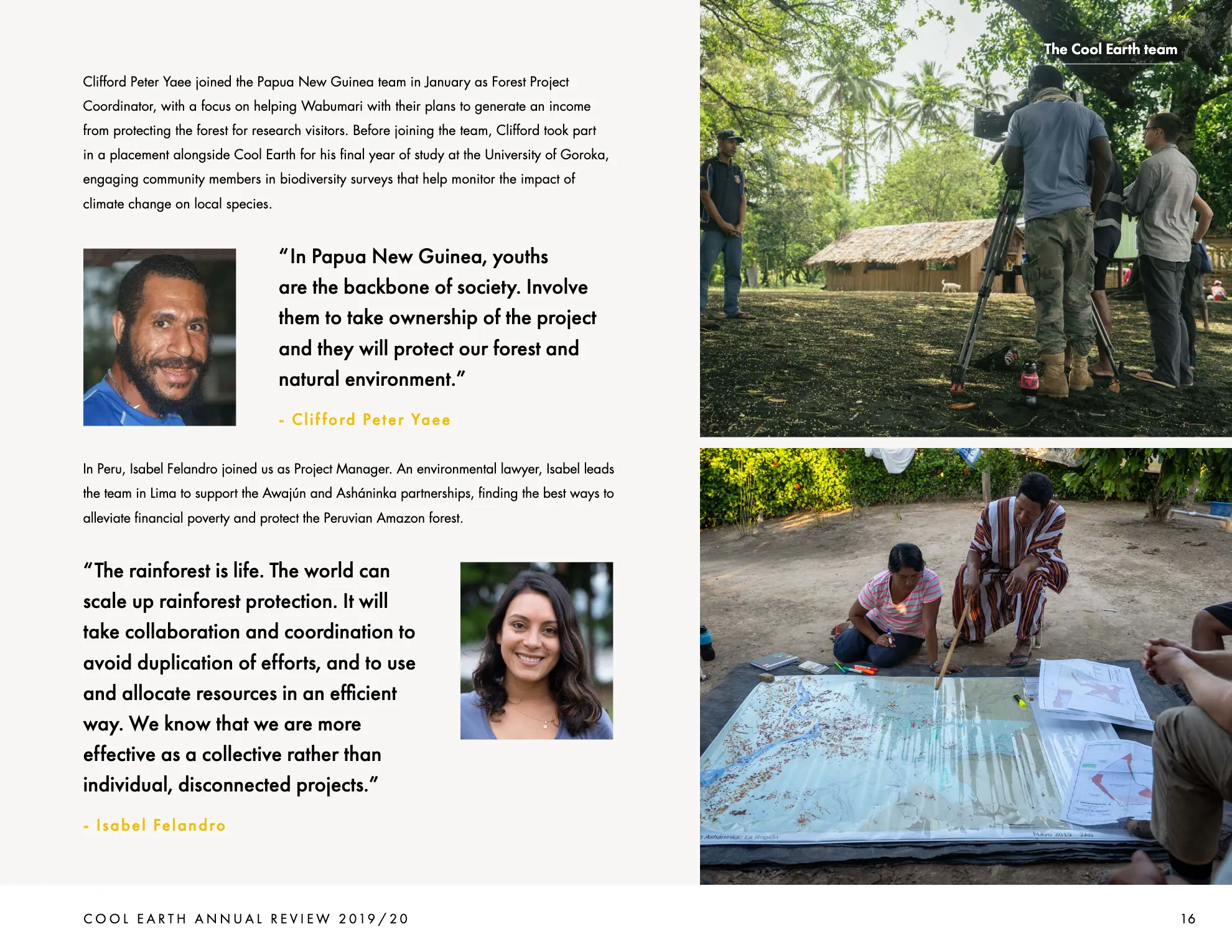 The Annual Review for 2019/2020 designed for Cool Earth to tell people what the charity is set up to do, what projects and activities happened and what it achieved each year.