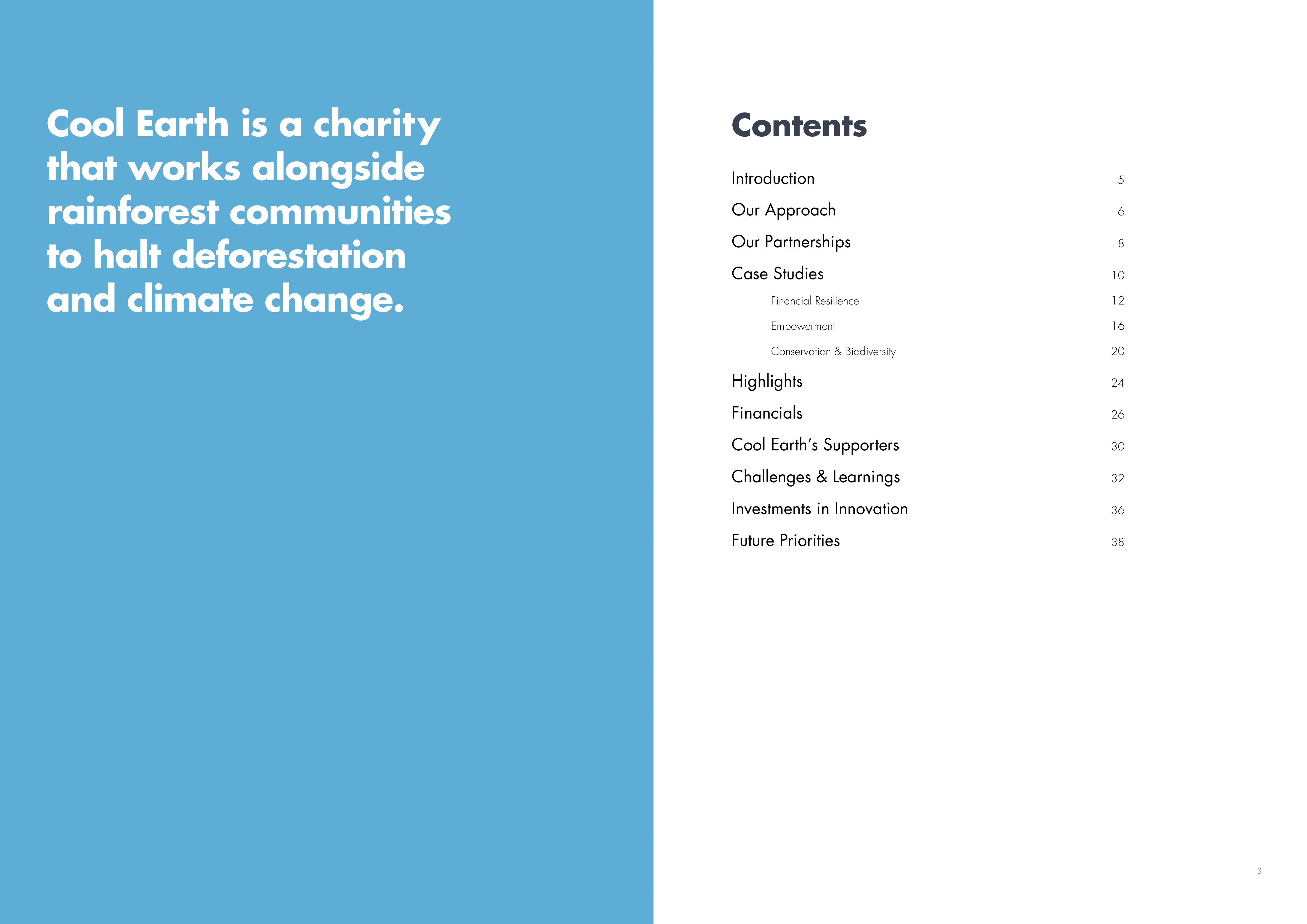 Annual reports designed for Cool Earth to tell people what the charity is set up to do, what projects happened and what it achieved each year.