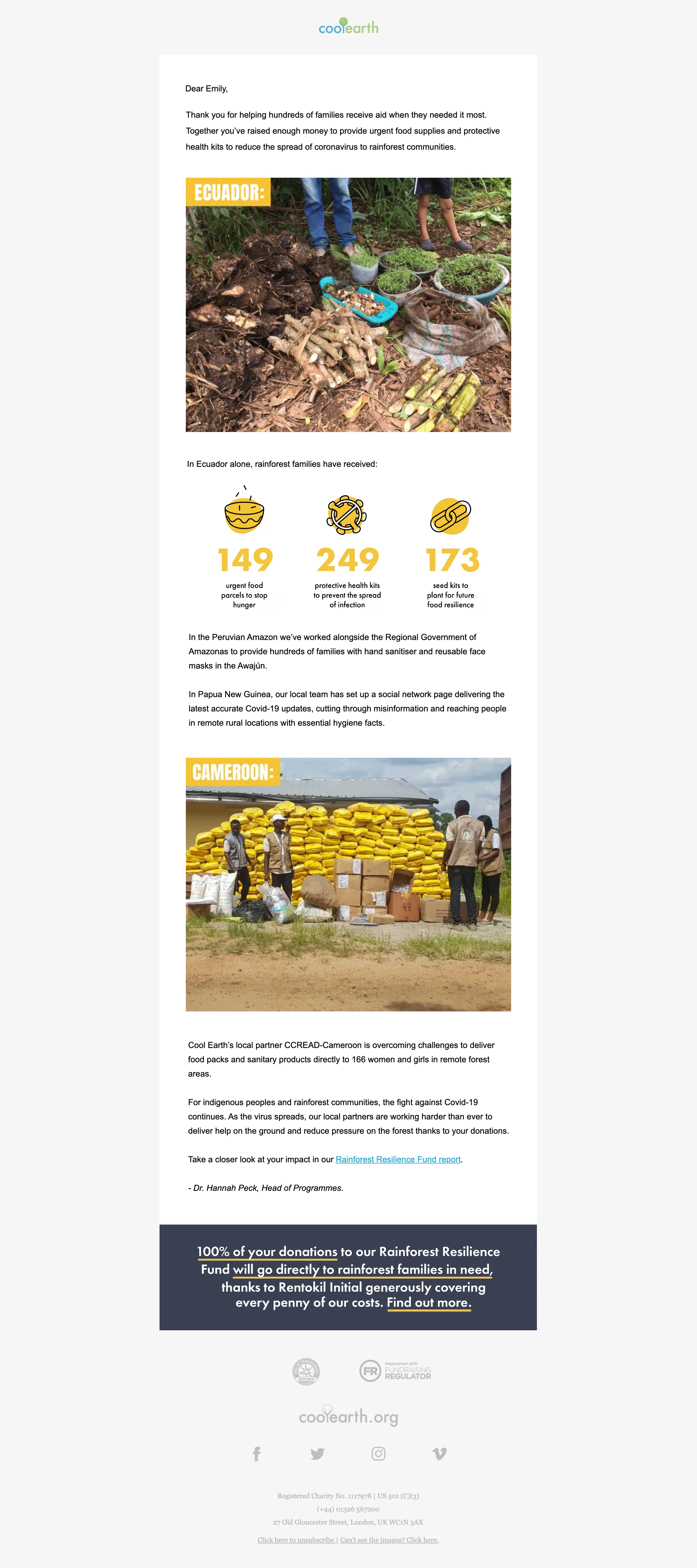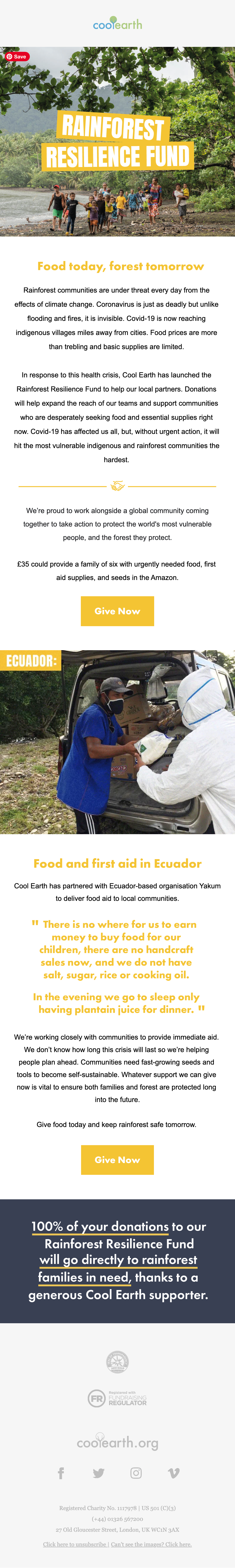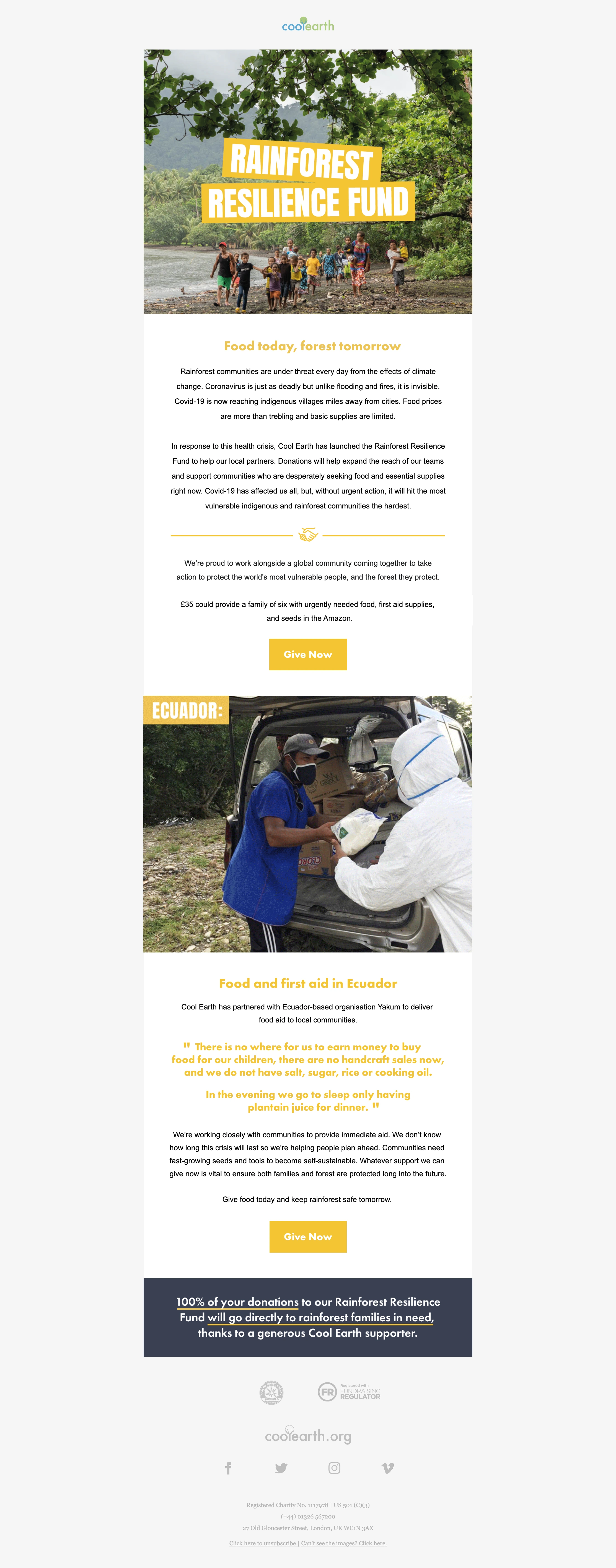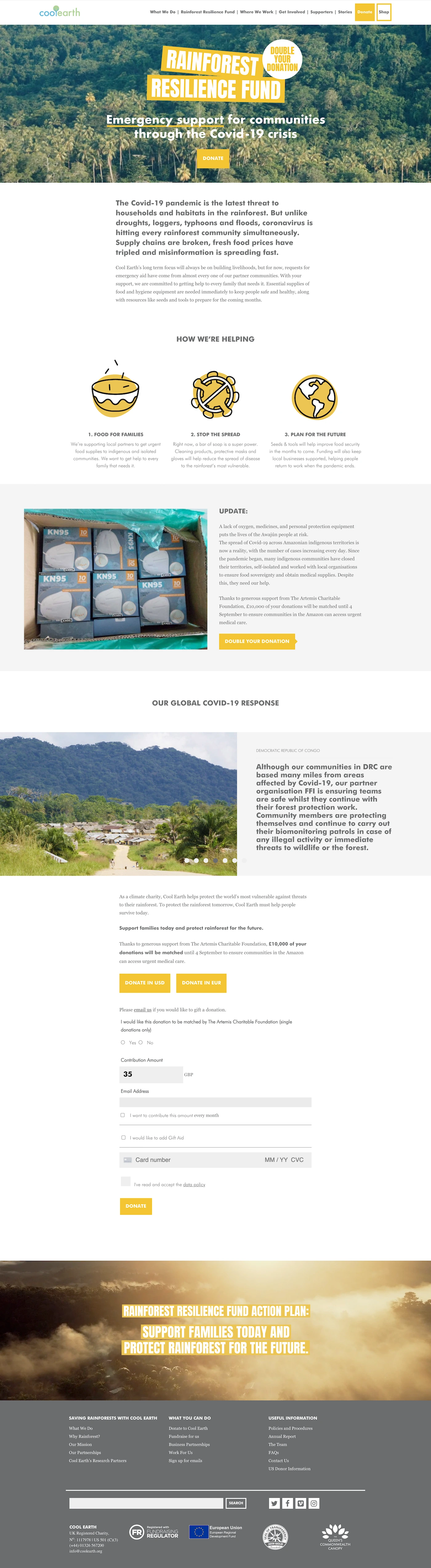 The Rainforest Resilience Fund was a Cool Earth fundraising campaign set up to help deliver cash, food, medical help and supplies to rainforest communities during the COVID pandemic.